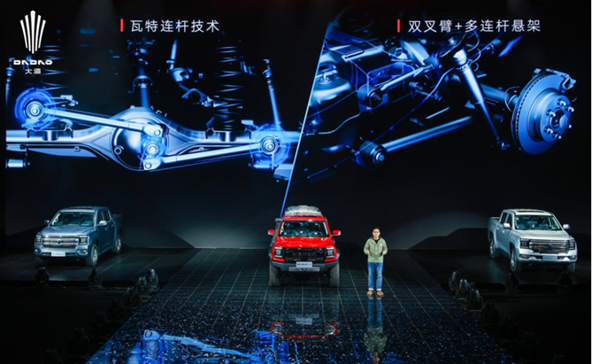考虑到皮卡用途广泛、工况复杂等特殊性,大道皮卡的强悍底盘采用的是双叉臂加多连杆悬架,拥有同级最优的220mm悬挂行程,搭载氮气减震器后,可将车身再抬升2寸,再加上7种不同模式的全地形管理系统,使得新车能够轻松应对各种复杂路况,满足用户全场景用车需求。
