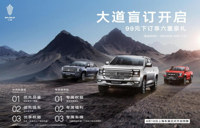据悉,大道的盲订活动将持续到4月17日,通过江铃皮卡官网,微信小程序搜索江铃福特商用车商城或江铃智行、联系当地经销商扫描大道盲订二维码仅需99元订金即可尊享6重豪礼,包括优先品鉴、优先提车、优享“同道中人”活动权益在内的三大优先权益包,以及直享预售豪礼、500元京东卡、1:18大道乘用版精品车模(7月按订单顺序发放)在内的三大专享提车包。