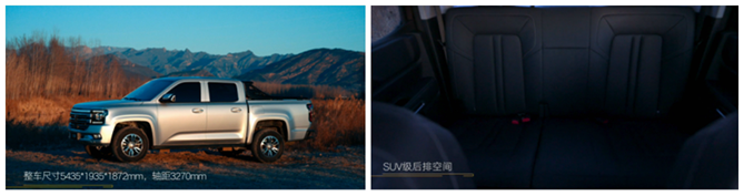 在用户非常关注的乘坐空间方面,江铃大道将自身优越的大车身尺寸发挥到了极致,营造出更加宽适的驾乘体验。其轴距为3270mm,整车尺寸为5435*1935*1872mm,妥妥的是标准的中大型皮卡,超大尺寸带来SUV级的后排空间,加上乘用化水准的高品质内饰,乘坐更舒适。其后车门更是采用75°超大开门角,且第二排座垫采用折叠锁止&悬空式设计,让后排能化身为出行的“物资仓库”,更轻松装载大件物品。