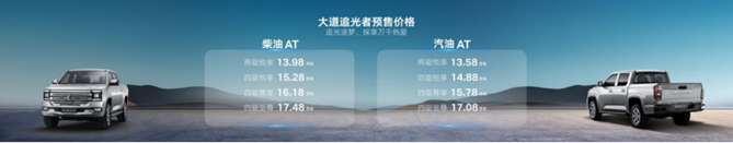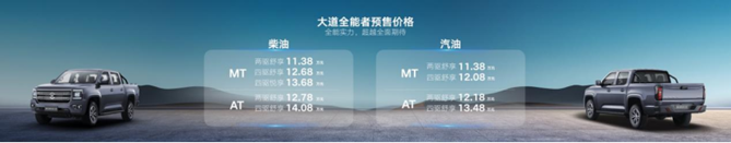 在车展预售发布会现场,江铃大道宣布大道商乘版和大道乘用版正式命名为全能者(全能实力,超越用户期待)和追光者(追光逐梦,与用户探享万千热爱),全能者包含手自动、两四驱多款车型,其中,柴油版5款车型,预售价格11.38万-14.08万,汽油版4款车型,预售价格11.38万-13.48万;追光者全系标配8AT自动档,其中,柴油版4款车型,预售价格13.98万-17.48万,汽油版4款车型,预售价格13.58万-17.08万!用户通过江铃官网、微信“同道中人”小程序,江铃福特商用车商城小程序,江铃智行APP、江铃智行小程序等渠道均可参与预订。