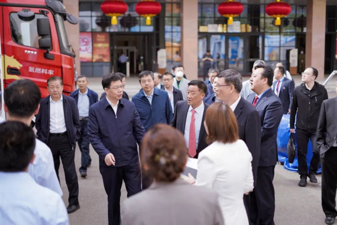 大会开幕仪式前,内蒙古自治区副主席、政府党组成员杨进,内蒙古自治区政协副主席、自治区工商联主席安润生与众领导嘉宾,共同莅临北奔重卡展位参观,听取工作人员介绍北奔重汽基本情况及氢能源系列产品,在听取介绍后参观领导对于北奔一直以来积极践行国家“双碳”战略,推动自治区绿色转型发展给予了充分肯定。