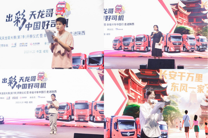 2023年8月20日,“出彩天龙哥·中国好司机”东风天龙哥大赛(第7季)开赛仪式暨幸福卡车中国行走进陕西在古都咸阳走心开启。东风商用车有限公司党委副书记陈向阳、东风商用车有限公司营销部门党委书记高超、东风康明斯发动机有限公司事业部部长王奕佩、风神轮胎股份有限公司营销总监张明、东风汽车财务有限公司副总经理甘兵、陕西长凯汽车销售服务公司总经理李光华等领导,与300名卡友及家人、媒体等共同见证。