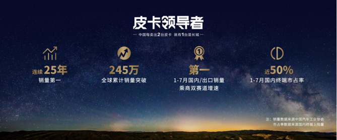 四年来,长城炮持续发力乘用休闲、时尚商用两大品类,引领皮卡品类创新、皮卡文化发展和用户共创。目前,长城皮卡已连续25年销量第一,全球累计销量突破245万。今年1-7月长城皮卡国内终端市占率近50%,中国每卖出两台皮卡,就有一台是长城。长城炮已累计35个月销量过万,蝉联皮卡销量冠军。