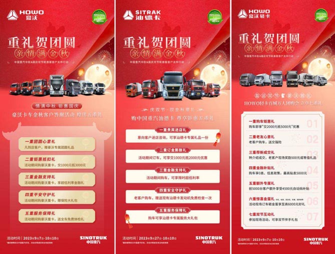 双节期间,豪沃、汕德卡、HOWO轻卡三大品牌梦幻联动,推出多重超值钜惠,三大品牌全系列车型加入“狂欢”,海量福利火热来袭,到店就得好礼,购车即享实惠,谁能不心动?
