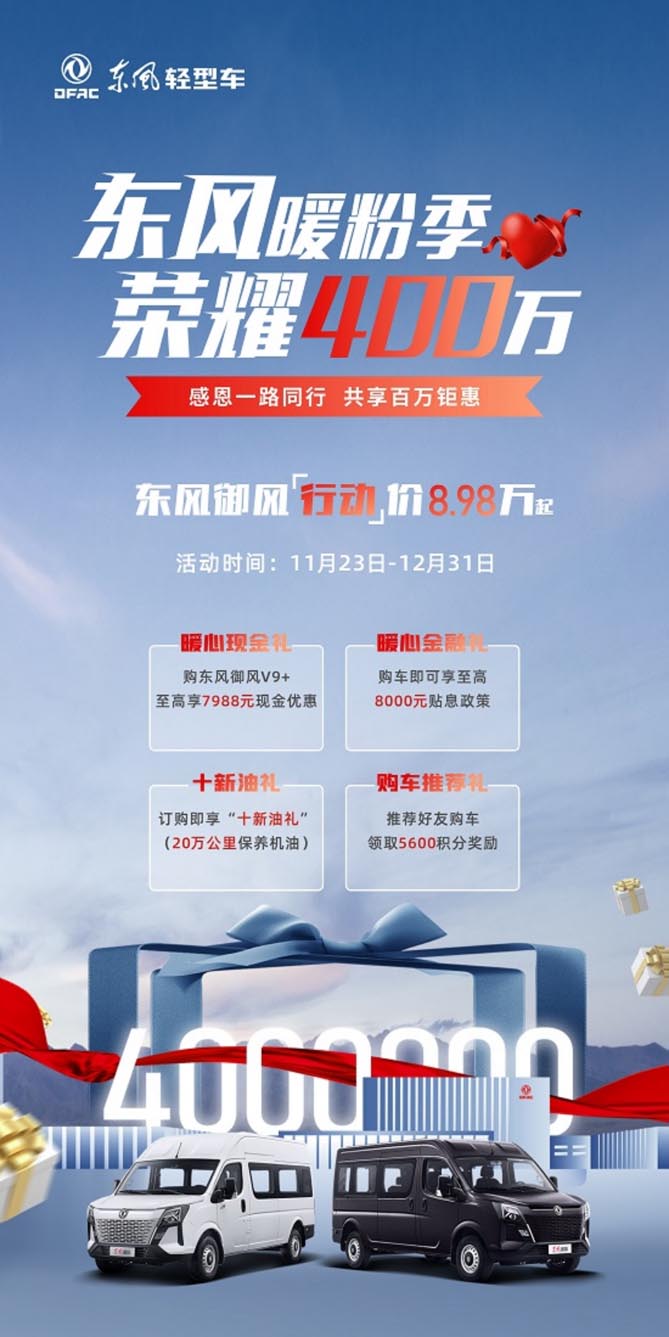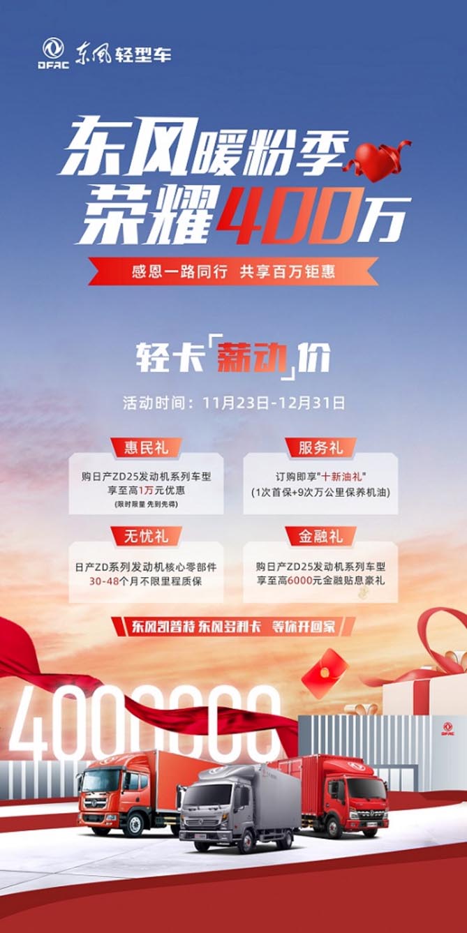 东风汽车股份有限公司智能制造和绿色工厂新总装落成,以及第400万辆车即将下线,双重成就共铸荣耀时刻。 为全面回馈客户信赖,感恩携手同行,11月23日至12月31日期间,东风轻型车隆重推出“东风暖粉季 荣耀400万”回馈活动,百万钜惠,持续放送中。