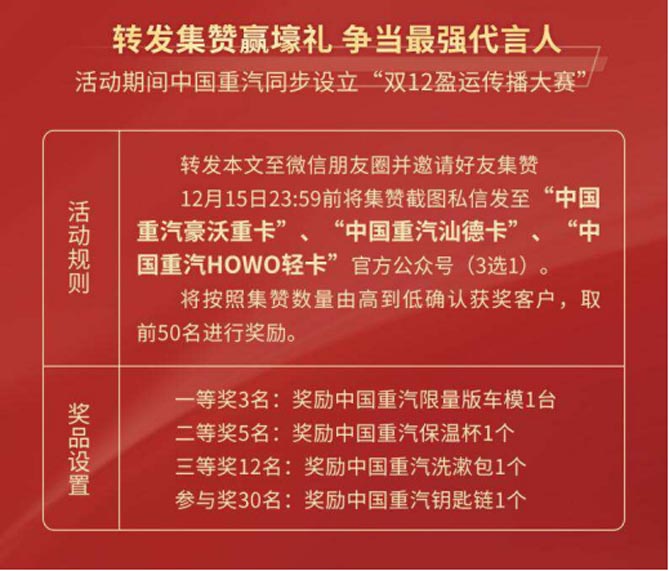 12月15日前,参与朋友圈转发积攒活动即可参与“双12盈运传播大赛”,赢卡车模型、保温杯、洗漱包、钥匙链等中国重汽精美周边,赶快动动手指,为中国重汽代言吧。
