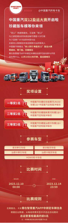 12月10日,重头戏正式上演,中国重汽双12盈运大赛火爆开赛。凡车载智能通正常使用的中国重汽豪沃牵引车、豪沃载货车、汕德卡牵引车、汕德卡载货车、HOWO轻卡客户,将自动参与五个组别的评奖,真正实现了零成本、零门槛参赛。12月15日,中国重汽将根据智能通12月10日00:00至12月14日23:59大赛期间客户实际运营数据,评选出各组别车辆5天的总运营里程最高的前6名客户,送出中国重汽珍藏纪念版车模+冲锋衣等精致好礼,更有机会收到中国重汽的神秘来电专访,全媒体平台分享属于我们卡友自己的营运故事……是谁在货运路上风雨兼程赶路只为使命必达?收件人也许不知道,但中国重汽却能做到心中有数,并且要为最忙碌的那个TA颁个奖!