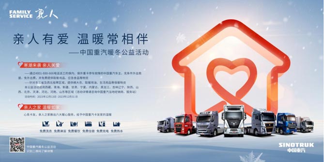 近期,今冬最强寒潮肆虐,北方多地雨雪交加,让很多离家在外的卡友来不及添置冬衣,甚至面临着食物短缺、燃油耗尽的威胁。自12月13日以来,“中国重汽‘亲人’服务雨雪天气停车故障暖心服务活动”在北方16个省份火热开展,为客户提供免费外出救援、蓄电池检测服务、车辆轮胎及底盘悬挂检查、防冻液冰点检测、应急食品等暖心服务,并开展新能源车辆冬季护航行动,用专业、敬业成为客户凛冬运营的最坚实后盾。