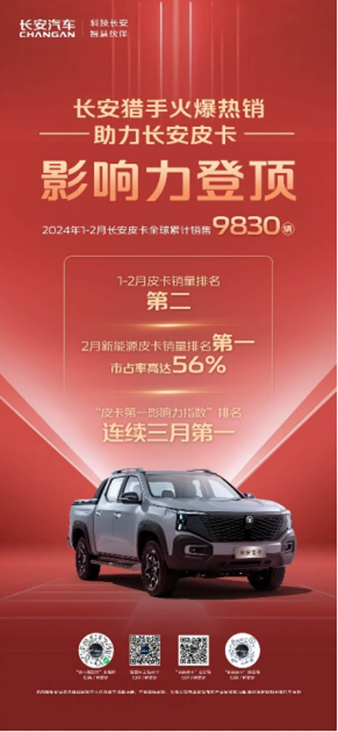 2024年1-2月,长安皮卡全球销量近万辆,皮卡销量排名第二,新能源皮卡销量更是强势登顶。特别是全球超级增程皮卡长安猎手的亮相以来,长安皮卡已经连续三个月,“皮卡第一影响力指数”排名第一。随着长安猎手的正式上市,增程皮卡也正在颠覆着全球皮卡市场格局。
