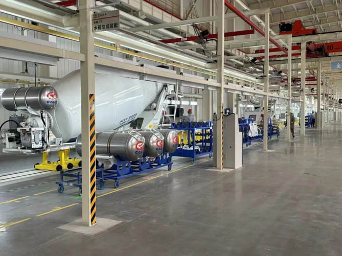 汉马科技新能源专用车生产基地在今年已全面投产,整个生产基地按照精益化、敏捷化、柔性化生产高水平产品的设计理念,采用先进、可靠、高效、高自动化的生产设备,涂装自动喷粉线全程采用通过式喷粉流水线,按照生产节拍由环形积放链高空转运工件;上装由AGV小车送至工位旁,采用双钩行车横向上线。整线上配备三台65寸显示屏,对生产订单、设备运行和螺栓扭矩进行目视化及信息留存,并采用MES管理系统,实现制造过程可控,数据在线采集,满足单班年装配能力超过10000辆新能源商用车,极大提升了新能源产品的质量和生产规模,为整车的高品质提供全方位保障。
