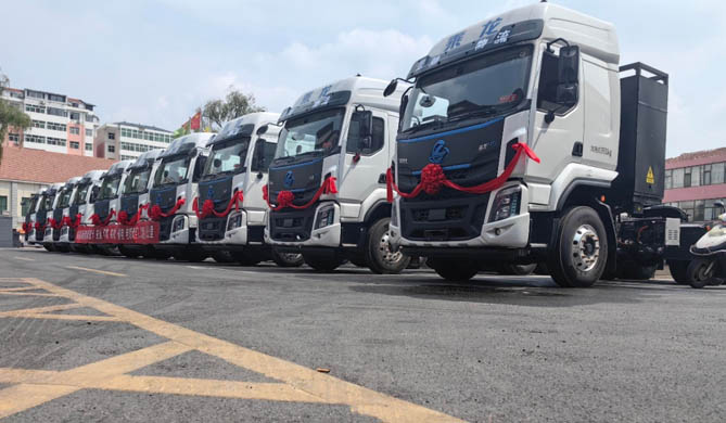 此次交付、订购的乘龙H5换电牵引车,采用国内顶尖的“黄金组合”动力链,配备行业顶级电芯284kWh、400kWh电池包,其能量密度高达165Wh/kg,充放电效率高达95.9%。同时,充换一体的设计使得车辆能在短短5分钟内完成快速换电,确保了24小时不间断的高效运营,特别适用于高频次的短途运输需求。