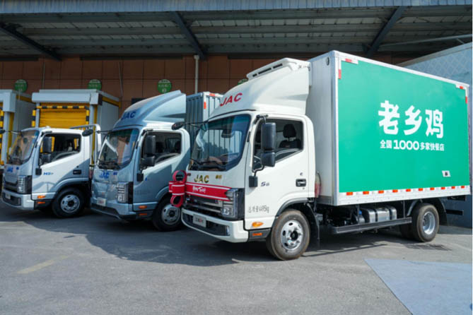 从母鸡养殖、食品加工到连锁经营,冷链运输是其中的关键一环。在老乡鸡合肥中央厨房,这里有一座5000吨级的仓储物流中心以及与之匹配的恒温冷链物流车队,确保食品安全。10多年前,老乡鸡就开始采购江淮1卡作为运输车辆。如今,老乡鸡以合肥为圆心,辐射整个安徽乃至全国,拥有100多辆江淮1卡冷藏车,提供强大的运输保障。