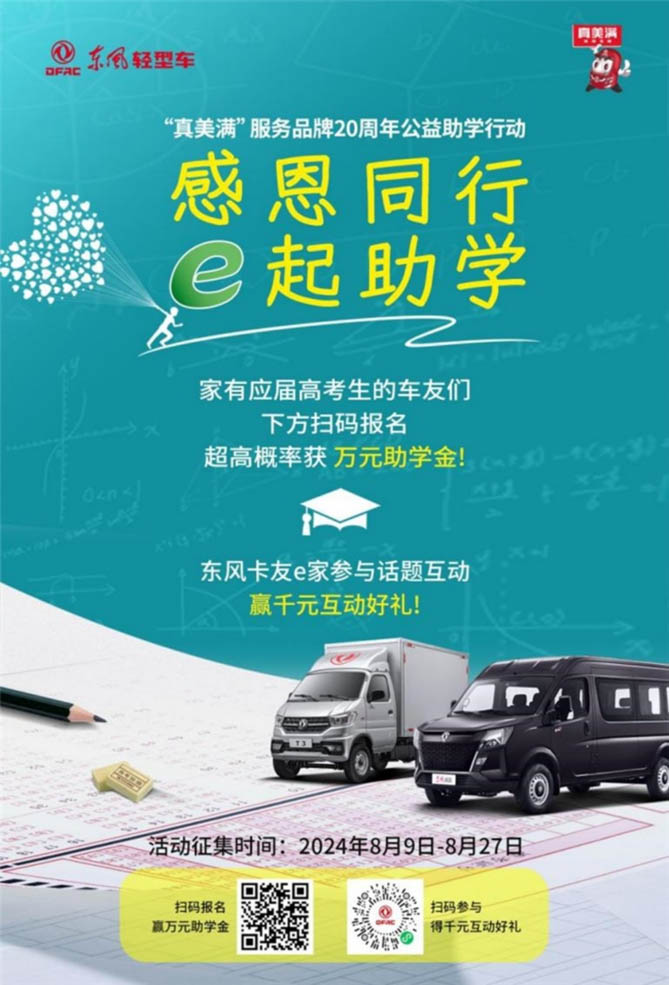 今年是“真美满”服务品牌20周年,我们将这份温暖与感动在这个夏天延续下来,继续以爱之名,开展我们的公益助学之旅,将目光聚焦于东风轻型车车主身上,为2024年度应届高考并成功被大学录取的青年提供助学基金。