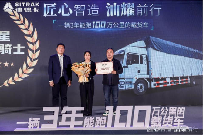 活动现场对五星百万骑士颁发证书,汕德卡“五星百万骑士团”的队伍日渐壮大,更多用户凭借“满勤”的成绩向世界展示中国重汽汕德卡高效运营之最!