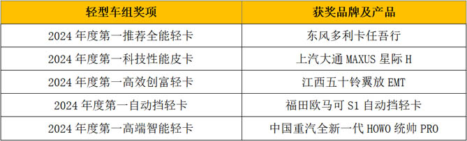 此外,为了推动商用车行业加快向新能源化方向发展,今年的新能源组评选设置了“2024年度第一畅销新能源重卡”、“2024年度第一推荐长续航标杆重卡”、“2024年度第一畅销新能源牵引车”、“2024年度第一畅销新能源工程车”、“2024年度第一推荐新能源重载轻客”、“2024年度第一推荐全能小卡”、“2024年度第一推荐城配物流车”、“2024年度第一长续航新能源小卡”、“2024年度第一期待新能源轻客”、“2024年度第一纯电四驱皮卡”等奖项。在零部件领域,本次评选设置了“2024年度第一推荐蓝牌轻卡动力”、“2024年度第一推荐新能源重卡动力总成”、“2024年度第一节油动力”、“2024年度第一节能轻卡电驱桥”等重磅奖项。