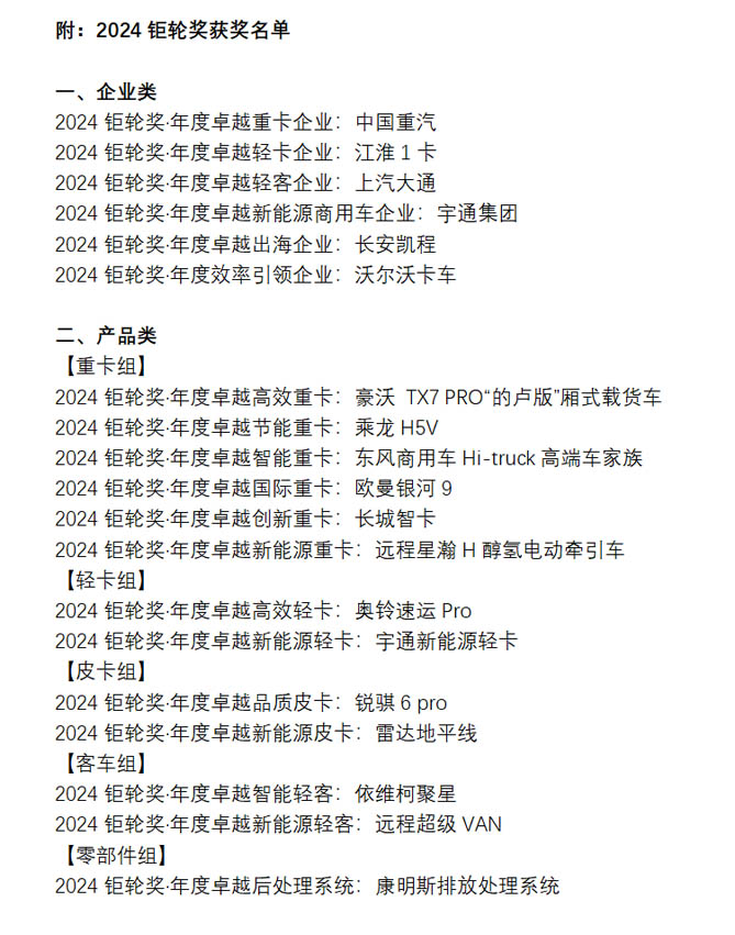 商用车领域权威评选 2024钜轮奖19项大奖揭晓
