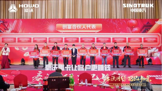 在热烈的掌声中,豪沃重卡为功勋卓越的“创富合伙人”与“豪沃代言人”举办了荣耀颁奖仪式,他们以卓越的运营智慧和拼搏精神,在临沂大地书写了"车轮上的财富传奇"。这些行走的品牌名片以真挚口碑搭建信任桥梁,用每一次真诚推荐诠释着“中国重卡第一选择”的深层内涵。