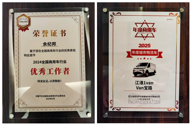 大会现场,江淮新能源轻卡EV5、江淮1van Van宝路两款新能源车型重磅亮相,VAN卡奔腾闪耀全场。Van宝路更是凭借卓越产品实力,在2025商用车界年度盛典中一举斩获“2025年度城市物流车”大奖,余纪邦荣膺"2024全国商用车行业优秀工作者"称号!