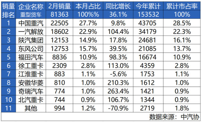 万物复苏之季,中国重卡市场焕发勃勃生机,奏响了2025年高质量发展的最强音。步入2月,我国重卡市场共计销售81363辆,环比上月72169辆上涨12.7%,同比大幅增长36.1%。其中,中国重汽以22505辆战绩继续问鼎月度销量冠军宝座,1-2月累计销售43705辆,市场占有率可达28.5%。在推动商用车行业高质量发展的征程中,中国重汽不仅是数据榜单的领跑者,更是引领行业转型与升级的中坚力量。