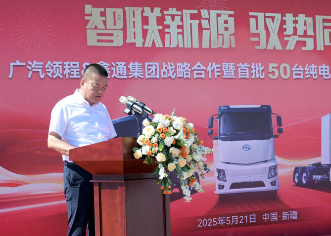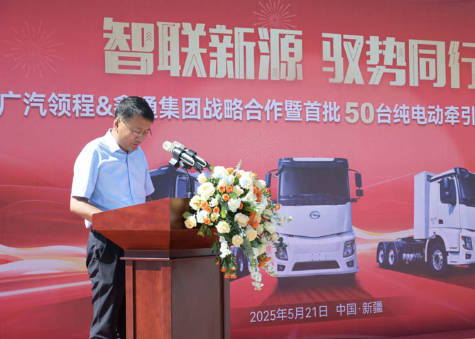 5月21日,广汽领程新能源商用车有限公司(以下简称“广汽领程”)与鑫通集团在新疆伊犁州新源县首平顺德物流园成功举行首批50台纯电动牵引车的交付仪式。此次交付,标志着双方共建新源县"绿色运输生态示范区"进入实质落地阶段。伊犁州商务局党组成员、办公室主任张强,新源县政府党组成员、工业园区党工委书记余勇,新源县商务和工业信息化局党组书记王玉新,扬州市援疆指挥组项目办主任康磊,广东省对口支援新疆工作前方指挥部驻疏附县工作队曹露组长、张成副组长,广汽传祺新疆总经理骆海天,鑫通集团董事长赵冠军,新源县首平顺德运输有限公司总经理李济慎,广汽领程党委书记夏强等领导和嘉宾代表出席仪式。