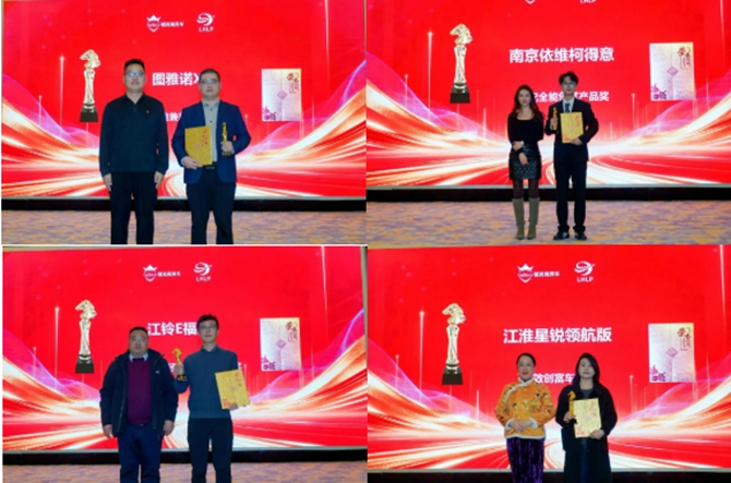 图雅诺X5 获得多能兼用产品奖,南京依维柯得意获得城配全能创富产品奖,江铃E福顺获得年度新能源轻客影响力品牌奖,江淮星锐领航版获得高效创富车型奖。