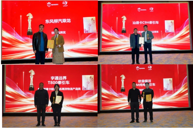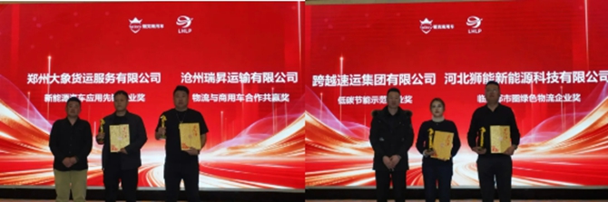郑州大象货运服务有限公司获得新能源汽车应用先锋企业奖,沧州瑞昇运输有限公司获得物流与商用车合作共赢奖,跨越速运集团有限公司获得低碳节能示范企业奖,河北狮能新能源科技有限公司获得临港都市圈绿色物流企业奖。