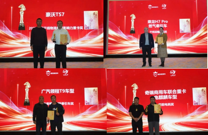 豪沃TS7获得 2025年度干线物流最具影响力重卡奖,乘龙H7 Pro燃气牵引车 获得干线运输新锐奖,广汽领程T9车型获得年度最佳创新牵引车奖,奇瑞商用车联合重卡电麒麟车型 获得极致电耗奖。