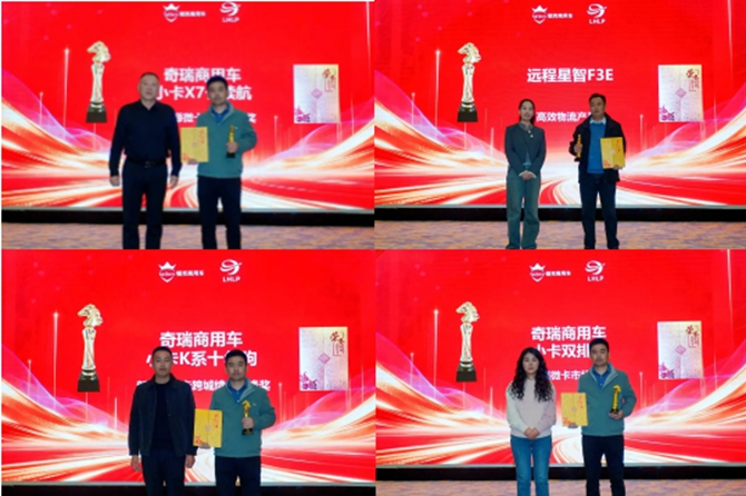奇瑞商用车小卡X7长续航版 新能源微卡销量桂冠奖,远程星智F3E 获得 高效物流产品奖,奇瑞商用车小卡K系十年驹获得新能源微卡跨城续航先锋奖,奇瑞商用车小卡双排王获得新能源微卡市场标杆奖。