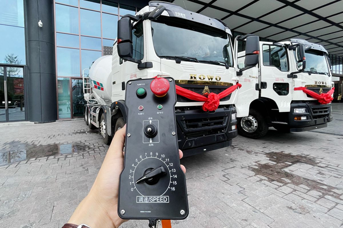 目前,豪沃TX智联搅拌车的装料卸料、罐体转动速度都采用了室内操作和遥控手柄两种操作方式。室内操作适合常规环境下来使用,而在环境较为复杂的地方,驾驶员可以离开驾驶室观察周围环境,然后通过遥控手柄操作罐体,既方便又安全。