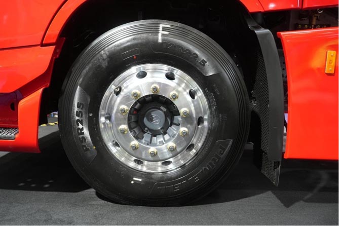 标配地滚阻轮胎,前桥使用铝合金轮圈,中后桥使用钢制轻量化轮圈,可进一步降低轮胎的滚动阻力,实现节能0.5%。