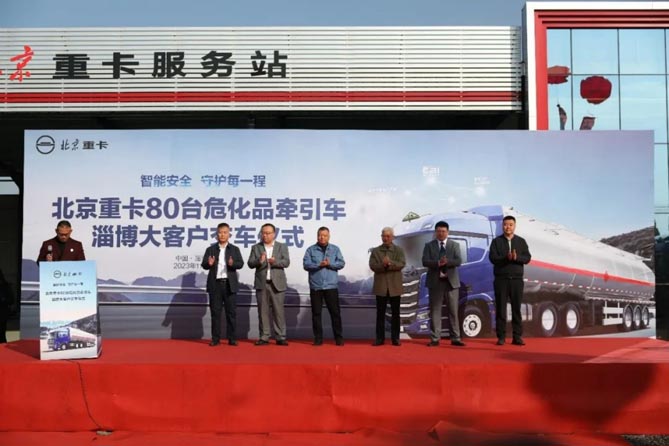 11月16日,山东淄博。在淄博市物流与供应链协会、行业客户代表等共同见证下,80台北京重卡危化品牵引车顺利交付山东淄博大客户。