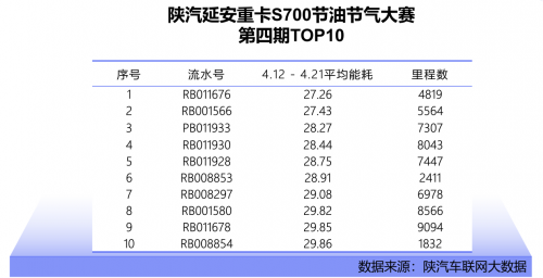 如果说赛事的前三期是卧虎藏龙、暗自较量,那么第四期的竞争态势则进入了胶着激烈的白热化阶段,据天行健智能车队管理系统数据显示,排名前十的延安重卡S700在能耗控制方面都有着出色的表现,均保持在30以内,更为关键的是,各名次之间的能耗差距极为细微。