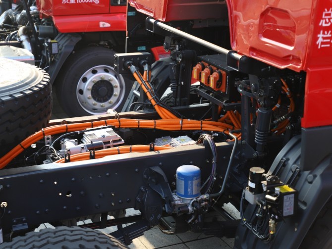 工程运输对动力的要求极为严苛。乘龙H7 8x4纯电自卸车配置绿控550KW超大功率电机(可爆发748马力),搭配4档AMT智能变速箱,形成高性能动力总成。无论是矿区陡坡还是泥泞工地,车辆起步迅捷、爬坡有力,即便满载状态下也能保持稳定输出,彻底告别动力不足的困扰。