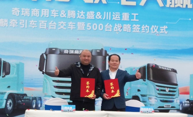 2026年3月12日,以“麒心协力 驭电共赢”为主题的奇瑞商用车&腾达盛&川运重工电麒麟牵引车百台交车暨500台战略签约仪式在四川德阳隆重举行。现场电麒麟牵引车整齐列阵,共启西南绿色物流迈向规模化运营的关键一步。