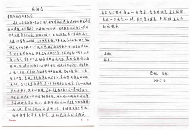 车辆“病痛”解除后,周先生悬着的心终于落地,顺利开车驶向卸货点。事后他亲手撰写了感谢信表示:“本来以为要耽误大事,多亏欧曼服务站的师傅拿着配件来给我换上了,维修及时才避免我的重大损失,真是雪中送炭!”为了表达谢意,周先生特意定制了印有“情暖客户,优质服务”的锦旗,送到欧曼服务团队手中,字字句句都透着真诚的谢意。