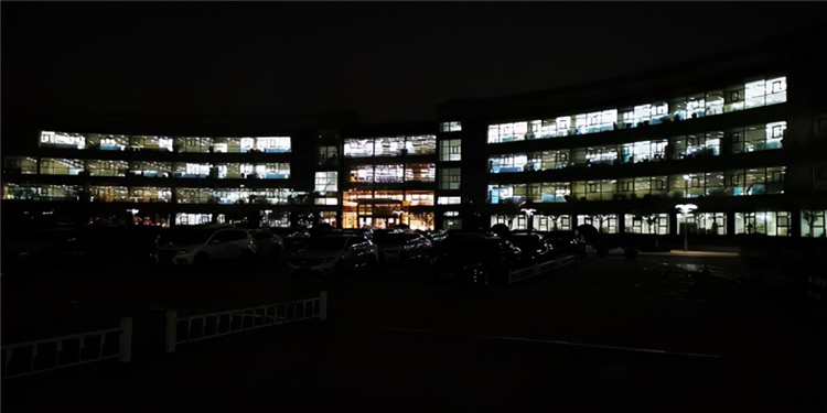 (记者从园区门口拍摄的晚上10点的潍柴研发大楼)