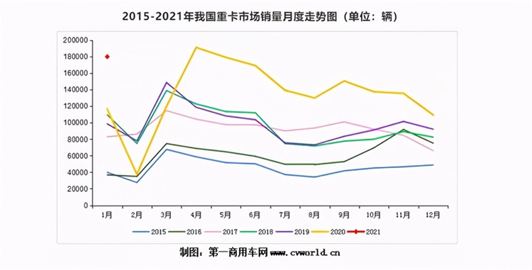 根据第一商用车网报道显示,2021年1月中国重卡市场预计销售各类车型18.9万辆(开票数口径),同比大幅增长62%,连续10个月刷新单月历史纪录。潍柴动力的两大重要客户陕重汽和中国重汽合计销售5.05万台,占总销量的27%。